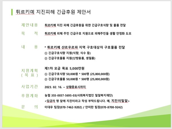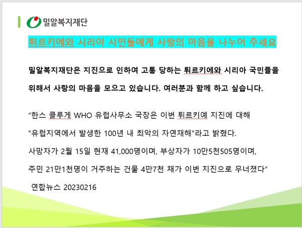 이전 기사보기 다음 기사보기 밀알복지재단튀르키예&시리아 지진피해 긴급지원 제안서 스크롤 이동 상태바 현재위치 교회와 기관 밀알복지재단튀르키예&시리아 지진피해 긴급지원 제안서 입력 2023.02.17 11:29 글자 크기 본문 글씨 키우기 본문 글씨 줄이기 프린트 인쇄하기 SNS 기사보내기 기사저장 다른 공유 찾기 이 기사를 공유합니다 닫기 저작권자 © 본헤럴드 무단전재 및 재배포 금지 관련기사 장애인 권익 기금 마련을 위한 『밀알나눔 음악회』 개최 우크라이나를 위한 평화 콘서트, 전쟁이 종식 될 때까지 계속 돼 【밀알복지재단】콘서트 '힘내요, 우리' 라이브방송 안내 【뉴스】 사회복지법인 밀알복지재단 경기지부, 본헤럴드와 업무 협약 맺어 본헤럴드 webmaster@bonhd.net 다른기사 보기 개의 댓글 회원로그인 작성자 비밀번호 댓글 내용입력 댓글 정렬 최신순 추천순 답글순 BEST댓글 BEST 댓글 답글과 추천수를 합산하여 자동으로 노출됩니다. 닫기 더보기 댓글삭제 삭제한 댓글은 다시 복구할 수 없습니다. 그래도 삭제하시겠습니까? 비밀번호 댓글수정 댓글 수정은 작성 후 1분내에만 가능합니다. 본문 / 400 비밀번호 내 댓글 모음 닫기