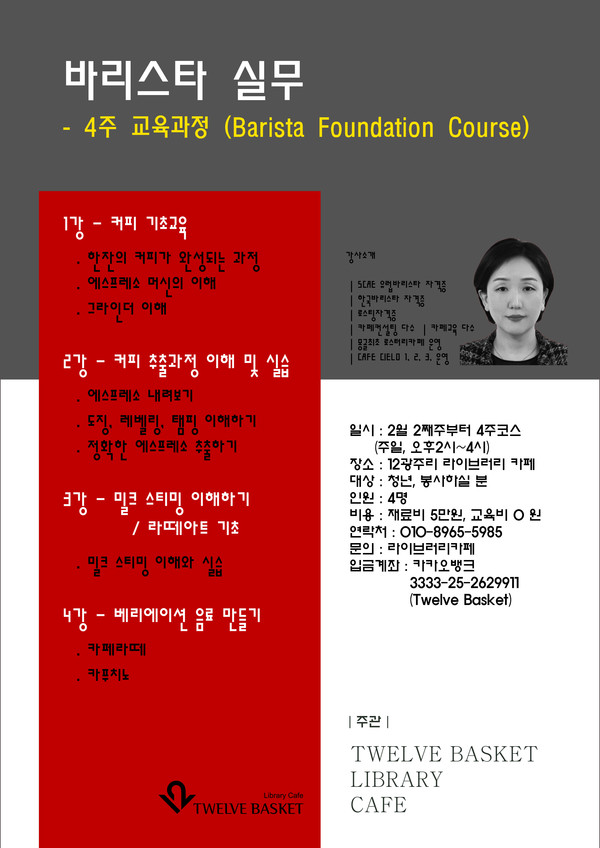 12광주리도서관카페에서는 2월부터 4주 바리스타 실무교육을 진행하고 있다. 강사 김정아 선교사는 몽골 선교사이며, 한국과 유럽바리스타 자격증을 소유하고 있으며, 카페운영 경험이 있다. 1기 교육생들이 한결같이 추천하기를 교육과정이 아주 우수하다고 말한다.