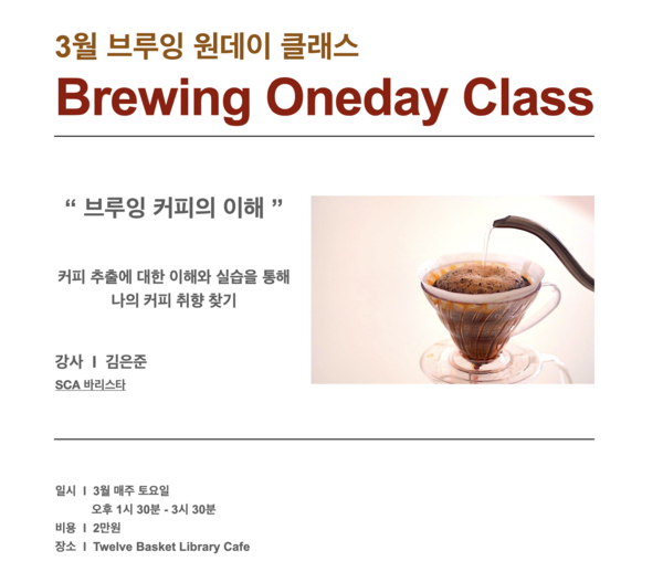 12광주리도서관카페는 3월 매주 토요일 "브루잉 원데이 클래스"를 시작한다. "브루잉 커피의 이해"라는 주제로 "커피 추출에 대한 이해와 실습으로 나의 커피 취향을 찾아"가는 수업이 진행된다.