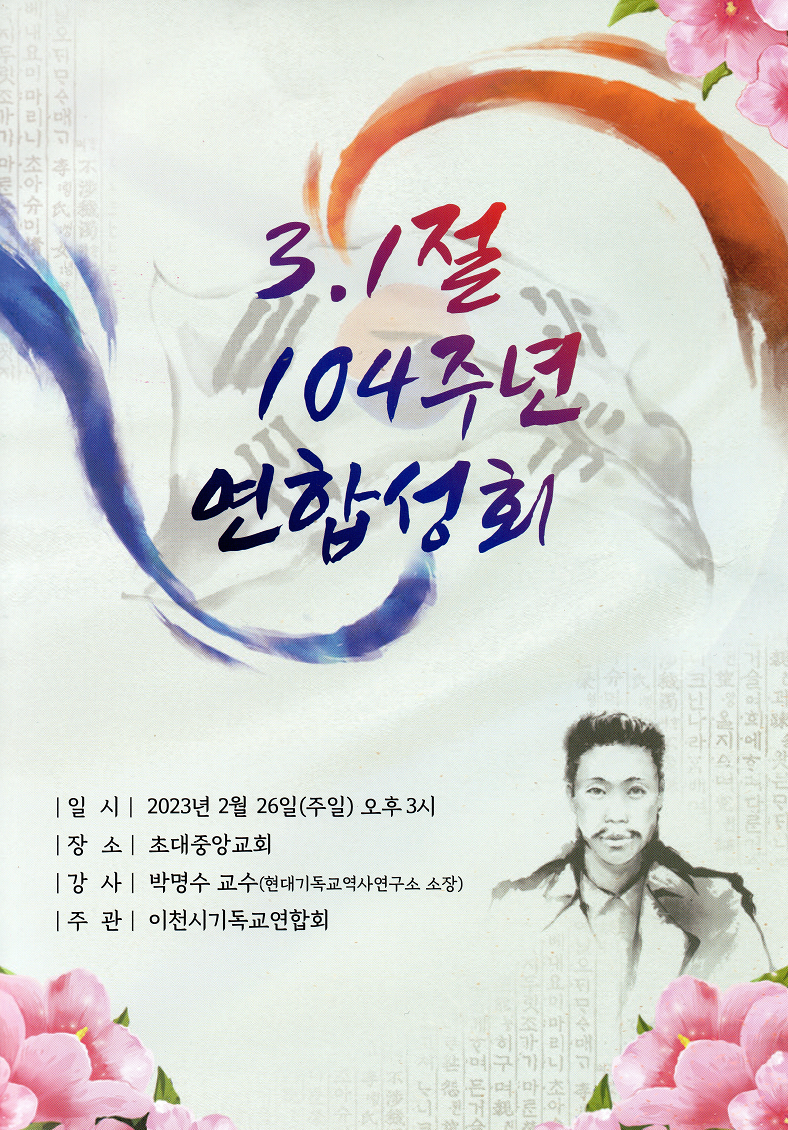 이천시기독교연합회(회장 이종목 목사, 기감 오천교회)는 지난 2월26일(주일) 초대중앙교회(증경회장, 담임 최요한 목사)에서 3.1절 104주년 기념예배를 드렸다. 이천시기독교연합회 소속 교회들과 약 500여명의 성도들이 참석한 가운데 김진석 목사(직전회장, 신둔교회)의 사회로 1부 예배가 드려졌다.