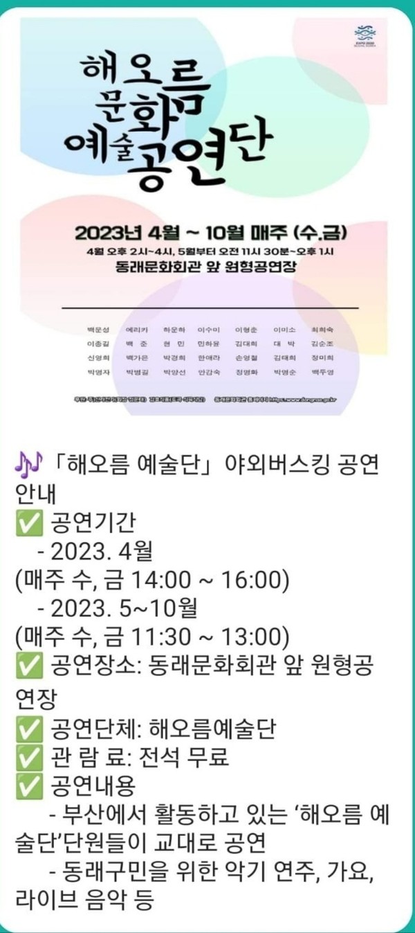 2030부산 세계 박람회 유치 성공을 기원하며 부산시민과 함께하는 최고의 문화예술공연이 4월 매주 수요일과 금요일 오후 2시부터, 5-10월은 매주 수, 금요일 11:30-13시까지 열린다.