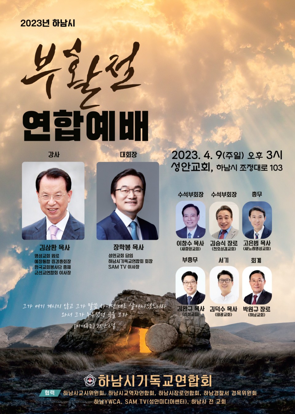 하남시기독교연합회(회장, 장학봉 목사, 성안교회)는 지난 9일(주일) 오후 3시 성안교회에서 2023년 하남시부활절연합예배를 은혜롭게 드렸다. 약 1000여명의 성도들이 참석한 가운데 드려진 부활절 연합예배는 김삼환 목사(명성교회 원로목사)를 강사로 초대해서 부활의 메시지를 나눴다.