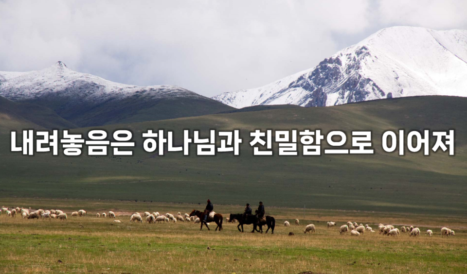 내려놓음은 늘 깨어 주님의 인도와 사랑을 구하는 마음을 잃지 않도록 해주는 윤활유다. 이 윤활유가 떨어지면 모든 기계가 뻑뻑해지고 마모가 쉽게 진행되어 파손되듯이 무너짐이 없도록 우리를 지켜주는 안전장치가 내려놓음이다. 욕심, 서두름, 명예, 권력, 부, 자기주장 등 어떤 것이든지 주님과의 동행을 가로막는 것은 하루빨리 내려놓기를 원한다.