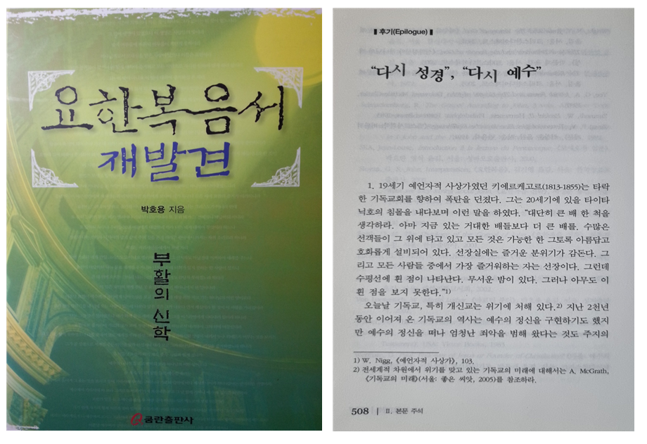 나는 내가 쓴 책을 강의에 꼭 필요한 경우 외에는 거의 다시 보지 않는다. 그런데 이 강연을 준비하기 위해 우연히 내 저서 『요한복음서 재발견: 부활의 신학』을 보게 되었다. 이 책은 2007년 6월 중국 선교사로 떠나기 직전에 펴낸 책이다(여기서 구약학 교수인 내가 신약문서인 요한복음에 관심을 갖게 된 동기에 대해서는 다음 기회에 자세히 말하고자 한다). 그런데 책 끝 “후기(Epilogue)”에 “다시 성경, 다시 예수”라는 제목이 있는 것이 아닌가!