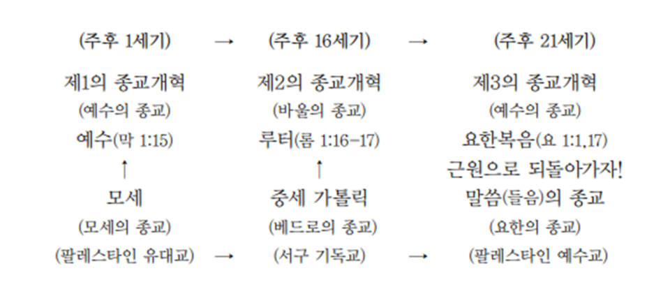 그와 더불어 제2차 세계대전 이후 핵개발과 인공지능(AI)시대를 맞이하면서 역사의 종말과 최후 심판을 다루는 <요한계시록> 연구가 시작되었다. 이제 드디어 ‘요한 르네상스’ 시대가 본격화된 것이다(이에 대한 자세한 내용은 다음 시간부터 다루도록 하자). 이를 제 3의 종교개혁이라고 부르고자 한다. 지금까지의 논의를 도표로 그리면 다음과 같다.