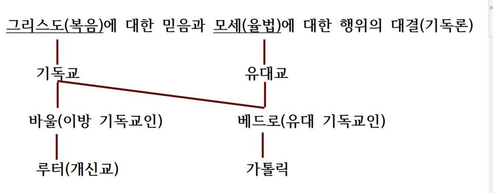 여기서 개신교는 구원은 오직 그리스도(복음)를 믿음으로 구원을 얻는 것이며, 모세의 율법(가령 안식일이나 정결예법 준수)을 행함으로 구원을 얻는 것이 아니라는 것이다. 이것이 이방 크리스천인 바울의 기독교의 모습이다. 이에 반해 가톨릭은 구원은 그리스도(복음)에 대한 믿음만이 아닌 모세의 율법과 같은 행위(가령 면죄부 구입이나 선행과 공로)를 더해야 한다는 것이다. 이는 유대인으로 크리스천이 된 베드로의 기독교의 모습이다. 이러한 구원론의 사상적 계보를 그려보면 다음과 같다.