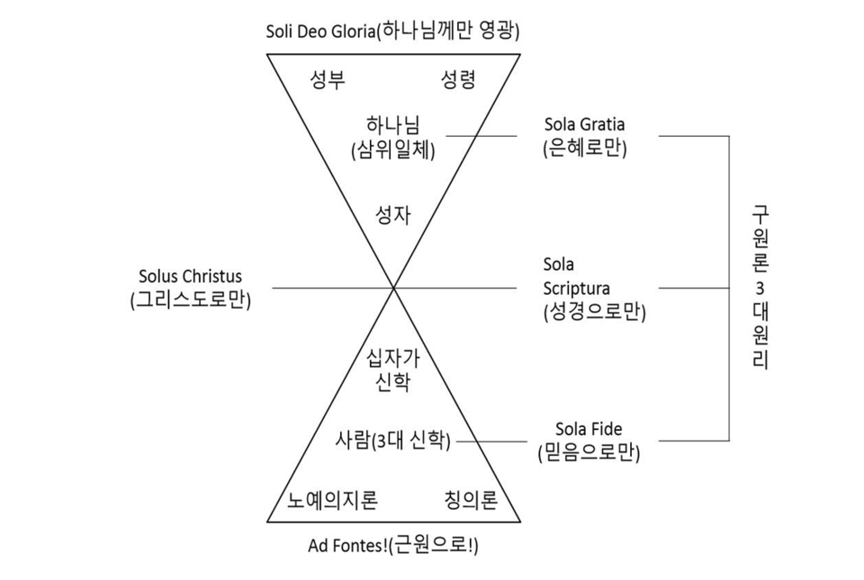 2. 이 도표의 의미(Ad Fontes!와 5개의 sola)를 설명하면 이렇다. 종교개혁의 중심문제는 <구원론>으로, ‘성서 안에 계시된(sola scriptura), 하나님의 은혜를(sola gratia), 사람이 믿음으로(sola fide) 구원을 얻는다는 것’, 이것이 ‘종교개혁의 3대원리’이다.