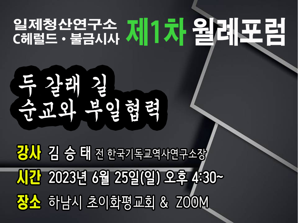 일제청산연구소(소장 양진우 박사)는 지난 25일(주일) 초이화평교회(하남, 담임 양진우 목사)에서 C헤럴드와 불금시사 공동주관으로 제 1차 월례포럼을 가졌다. 이번 월례포럼은 김승태 소장(전 한국기독교역사연구소장)은 『두 갈래 길 순교와 부일협력』란 제목의 특강을 맡았다.
