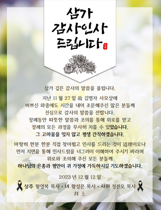 장례 일정을 마치고 상주 황영복 목사와 딸 황성은 목사 사위 정진오 목사는 조문과 부의를 베푼 분들께 감사하며, 부고답례문을 전했다.