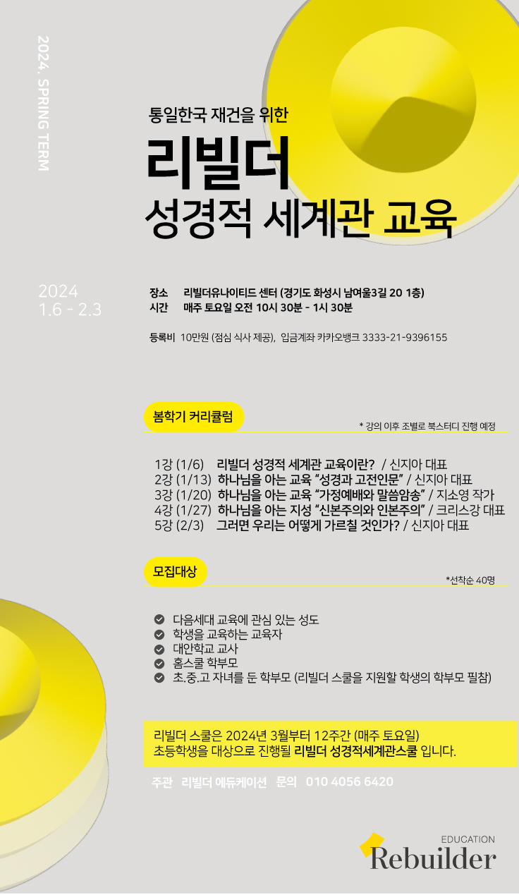 통일한국 시대를 재건할 사명이 있는 다음세대를 세우는 성경적 통합교육기관 리빌더에듀케이션(대표 신지아)에서 '성경적 세계관 교육을 어떻게 할 것인가?' 라는 주제로 2024년 겨울학기 리빌더 성경적 세계관 특강을 진행한다.