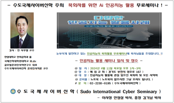목회자들의 호응에 의해 4월 11일 수도국제사이버신학 주최로 부천에 있는 예심교회(김기남목사)에서 “목회자를 위한 인공지능 활용 세미나”를 개최한다.