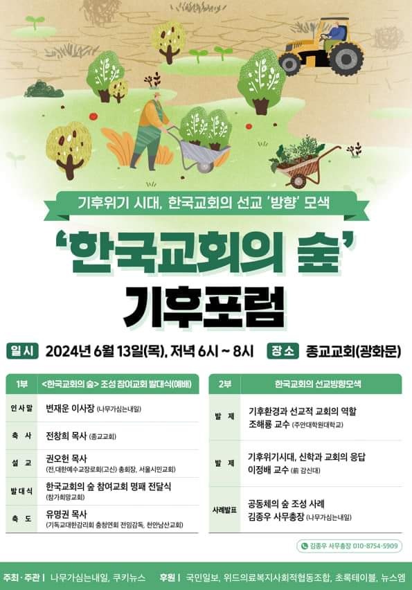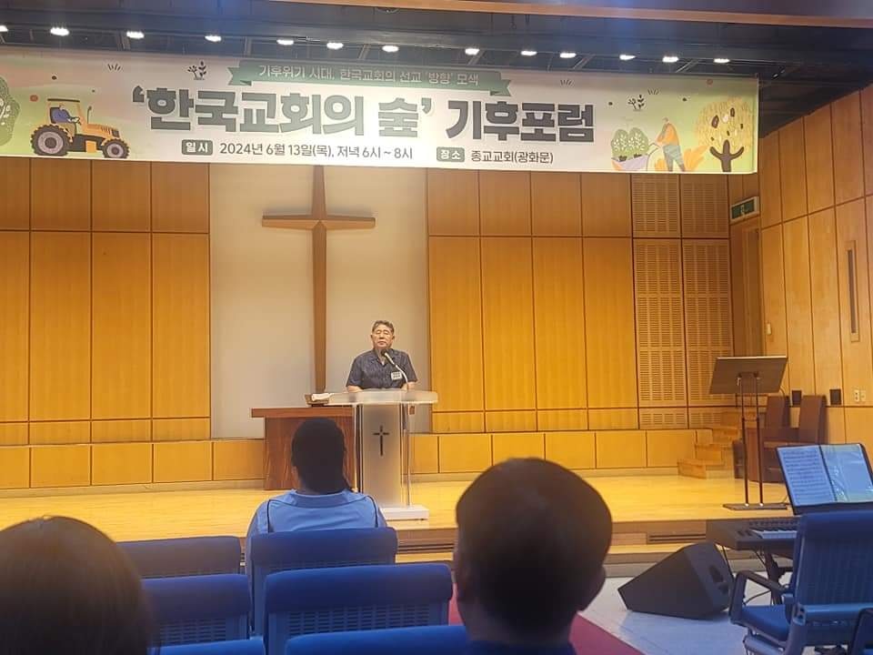 기독환경선교의 새로운 패러다임을 열어가기 위해 지난 해에 출범한 기독NGO (사)나무가심는내일(이사장 변재운)은 지난 6월 13일(목) 저녁 6시 종교교회(전창희 목사)에서 ‘한국교회의 숲’ 기후포럼을 개최했다.