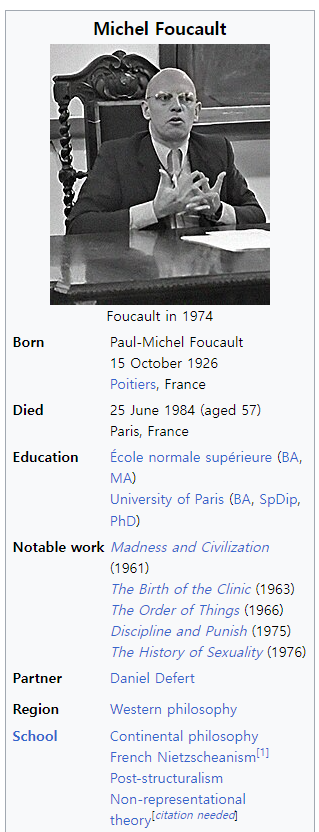 그후, Postmodernism, 즉 후기현대주의 시대가 되었다. 후기현대주의의 특징은 이성을 중심으로 한 어떤 격식이나 규범을 강조하던 모더니즘을 부정하는 것이다. 이는 2천여년 기독교 진리, 도덕, 전통의 가치 같은 것은 물론, 철학에서 칸트의 이성주의마저 부정하는 입장이다. 대표적인 학자들은, 우선 프랑스 철학자 폴 미쉘 푸코(Paul-Michel Foucault /1926 ~ 1984) 다. 그는 정신병동을 중심으로 한 정신병리학자로서 1961 “광기의 역사(The History of Madness)” 라는 책을 쓰기도 했다. 서구 인문주의에서 발생한 자유주의자로서 전통 도덕적 관념같은 것을 깨트려 버렸다. 그는 “성을 선용하라” 라는 말을 하기까지 했는데, 그것이 오늘날의 자유로운 성교환, 동성애 같은 행태를 일반 문화화 하는데 영향을 끼쳤다.