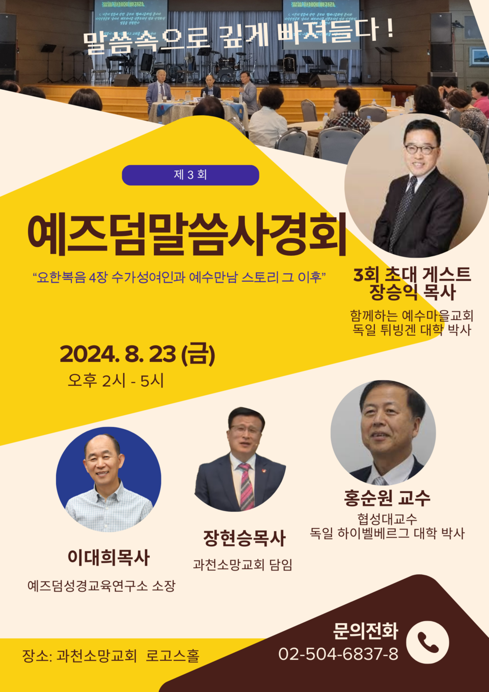 제3회 예즈덤말씀사경회가 지난 8월23일(금) 과천소망교회(담임 장현승 목사) 로고스홀에서 진행됐다. 예즈덤말씀사경회는 이대희 목사(예즈덤성경교육연구소 소장)와 장현승 목사(과천 소망교회)와 홍순원 교수(협성대학교, 독일 하이벨베르크 대학 박사)가 말씀섬김이로 진행하고 있다. 특별히 이번 제3회 예즈덤말씀사경회는 장승익 목사(함께하는 예수마을교회 담임, 독일 튀빙겐 대학 박사)가 게스트로 초대되어 말씀사경회에 함께 했다.
