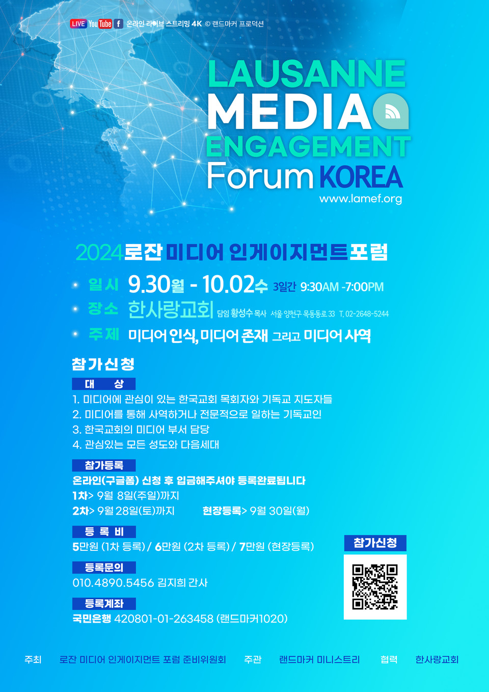 4차 로잔대회와 이어지는 국제 로잔 행사인 2024 로잔 미디어 인게이지먼트 포럼(Lausanne Media Engagement Forum)이 지난 9월30일(월) 서울 목동 한사랑교회에서 열렸다. 오는 10월 2일(수)까지 진행되는 로잔 미디어 인게이지먼트 포럼은 ‘미디어 인식(Media Awareness), 미디어 존재(Media Presence), 미디어 사역(Media Ministries)’을 주제로 현대 사회에서 미디어가 갖는 영향력과 이를 통한 복음 전파의 가능성이 논의되며, 참가자들은 주제 강연 및 선택 강의를 들은 후 그룹웍(Group work)을 통해 미디어참여 프레젠테이션의 응용 프로그램을 위한 협업과 네트워킹을 구축하는 시간을 가졌다.