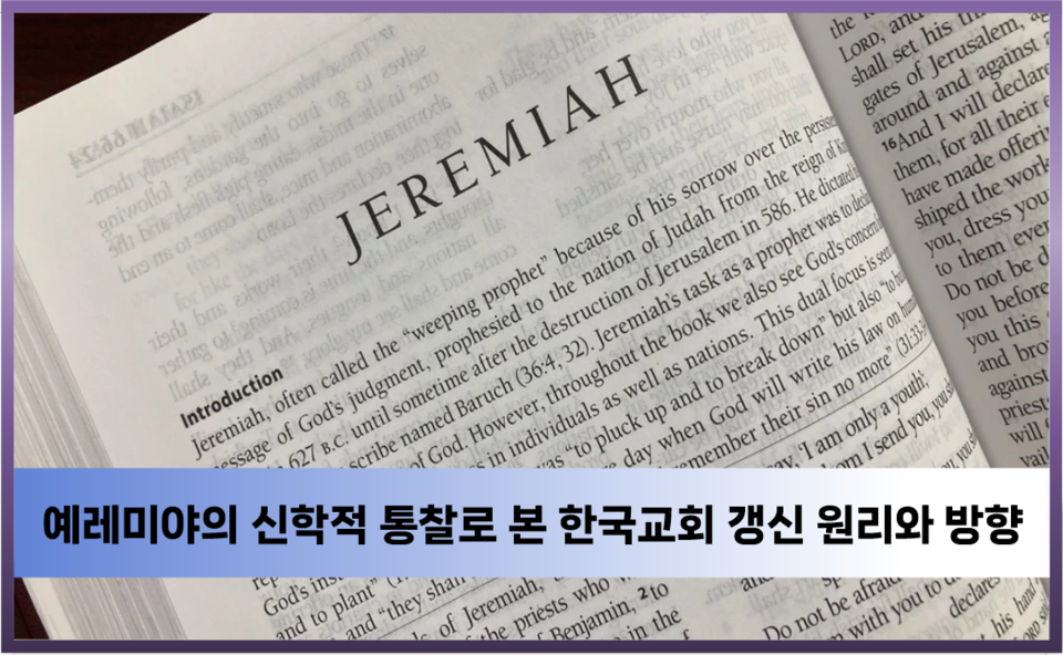 이와 같이 예레미야서의 메시지는 한국 교회가 개혁과 갱신을 이루는 데 중요한 지침이 된다. 회개와 갱신, 하나님과의 관계 회복, 사회 정의의 실천, 참된 예배의 회복, 영적 분별력 강화, 다음 세대를 위한 교육, 사랑과 공동체의 회복, 하나님의 말씀의 권위 회복, 전도와 선교의 중요성, 환경 보호와 창조의 존중 등 다양한 영역에서 교회가 변화할 필요가 있다. 한국 교회가 이러한 변화를 통해 하나님이 원하시는 참된 교회로 성장하고, 더 많은 사람들에게 복음을 전하며, 한국 교회가 하나님 나라의 확장을 이루는 데 온전하게 기여할 수 있기를 소망하며 기도드린다.