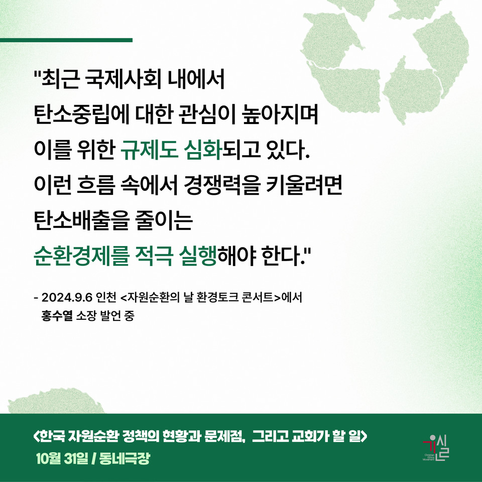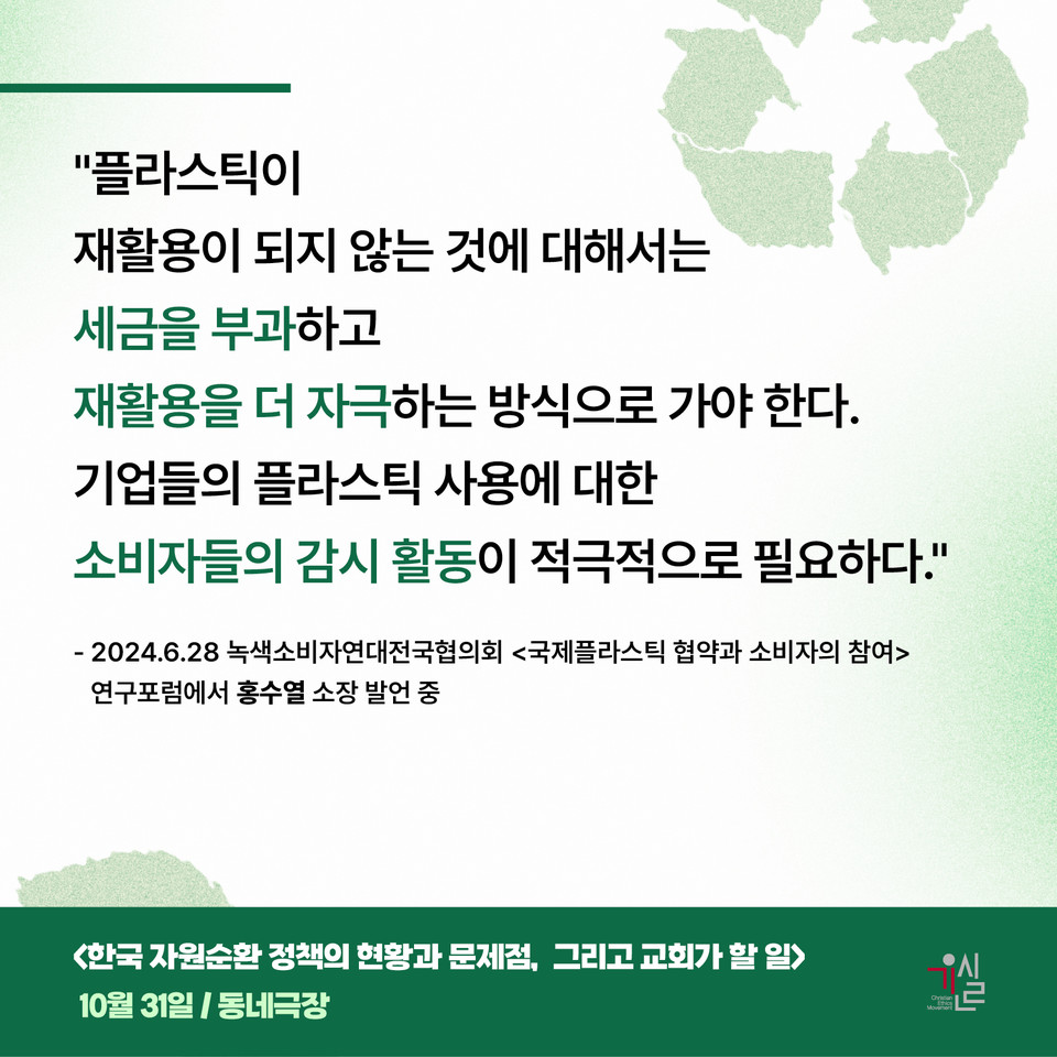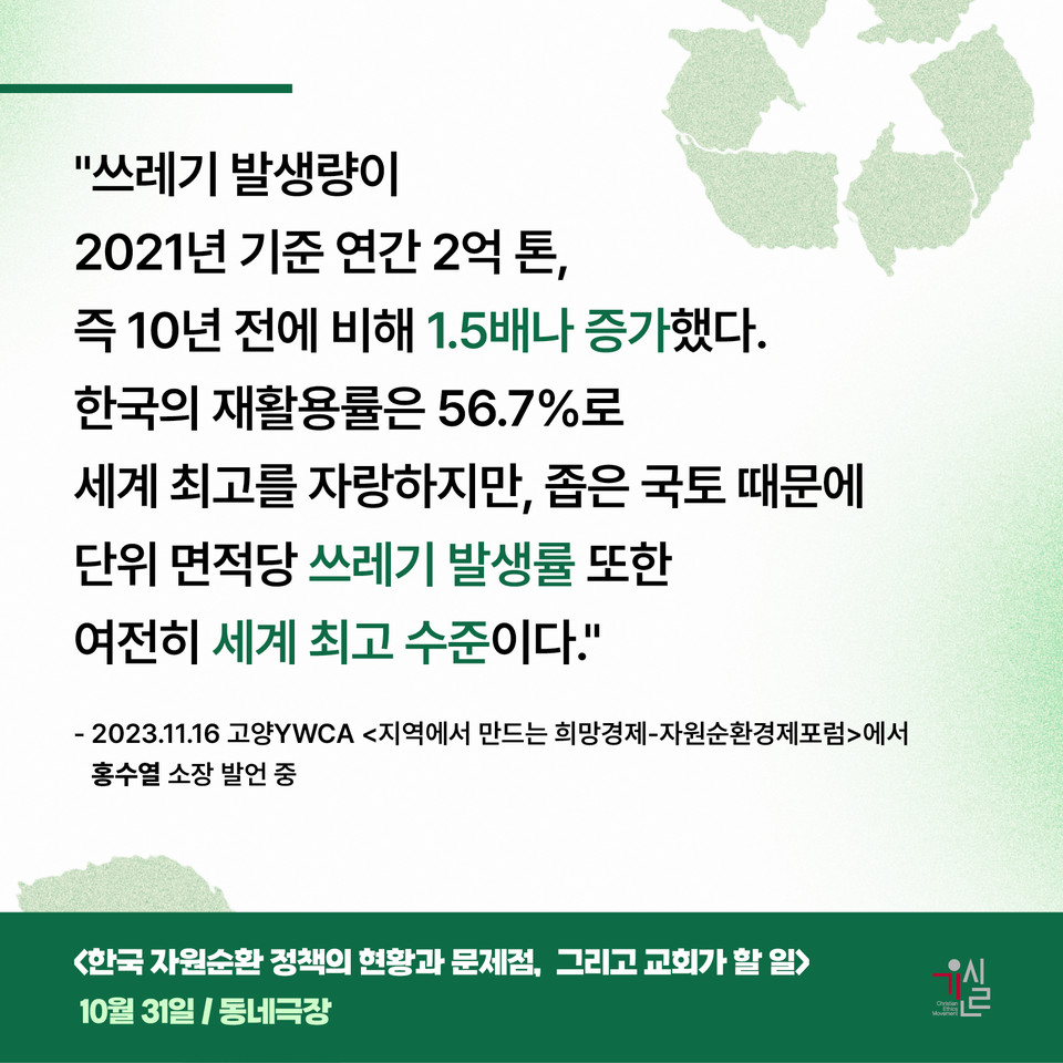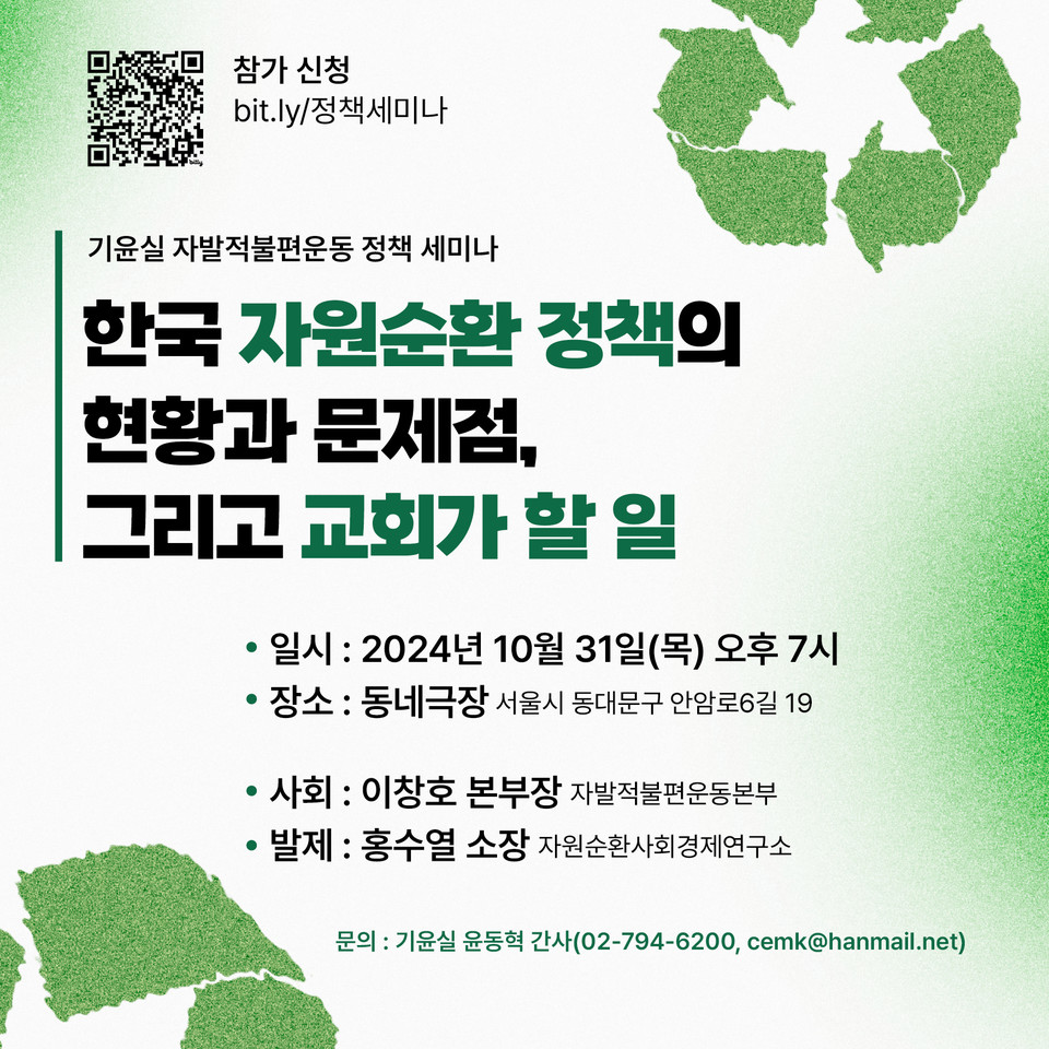 (사)기독교윤리실천운동 자발적불편운동본부는 기후 위기가 가속화되어 재난이 일상화 된 지금, 한국의 자원 순환 정책은 어떤 모습이며 한국교회는 무엇을 할 수 있는가? 돌아보는 세미나를 연다.