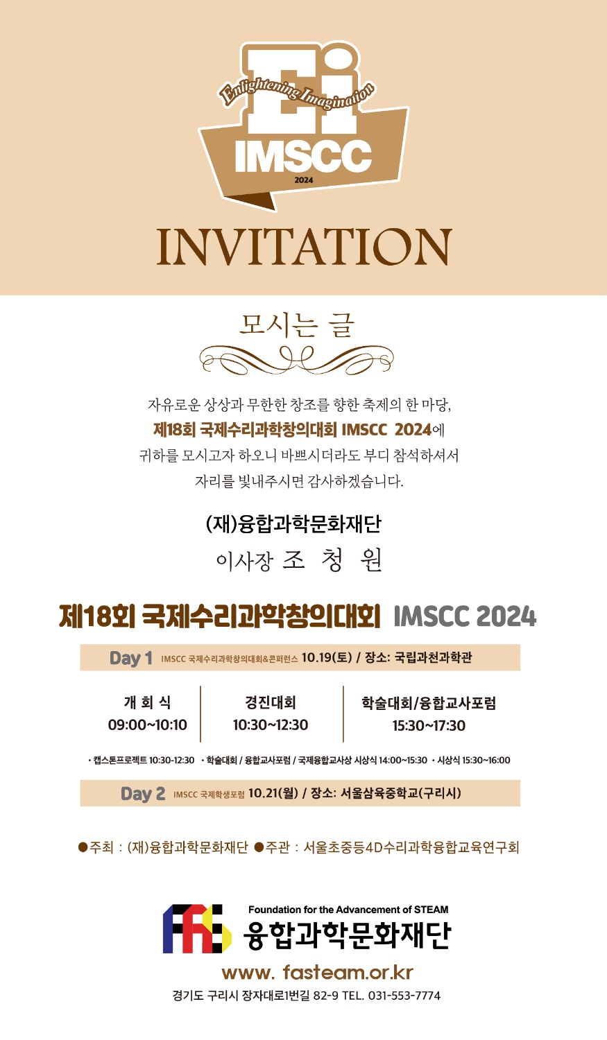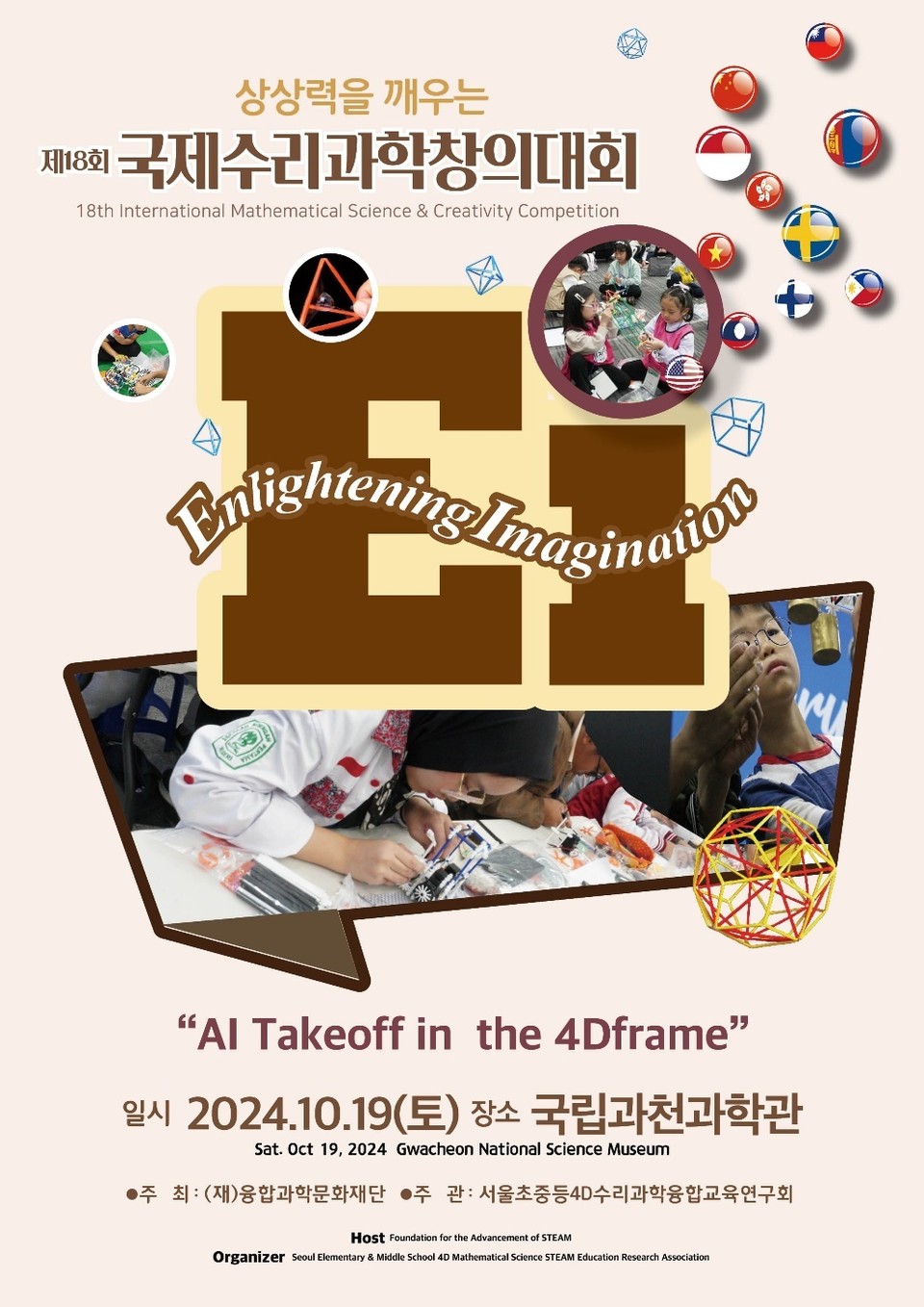 (재)융합과학문화재단이 주최하고 서울초중등4D수리과학교육회와 포디프레임학회가 주관하는 ‘상상력을 깨우는 제18회 국제수리과학창의대회 & 콘퍼런스(IMSCC 2024)’가 오는 10월19일(토), 21일(월) 국립과천과학관과 서울삼육중학교에서 진행된다.