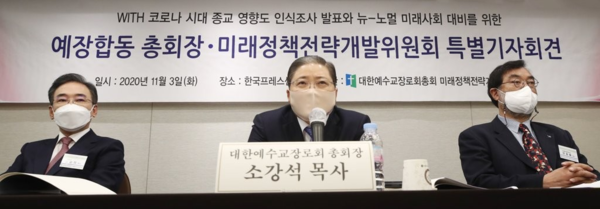 대한예수장로회(합동) 소강석 총회장이 지난 11월 3일 서울 중구 프레스센터에서 '예장합동 총회장·미래정책전략개발위원회 특별기자회견'에서 "코로나19 상황에서 한국교회가 세 가지를 잘못했는데 ①시대 정신과 가치를 제시하지 못했고, ②사회적 책임을 감당하지 못했으며 ③리더십을 세우지 못했다"고 진단했다.