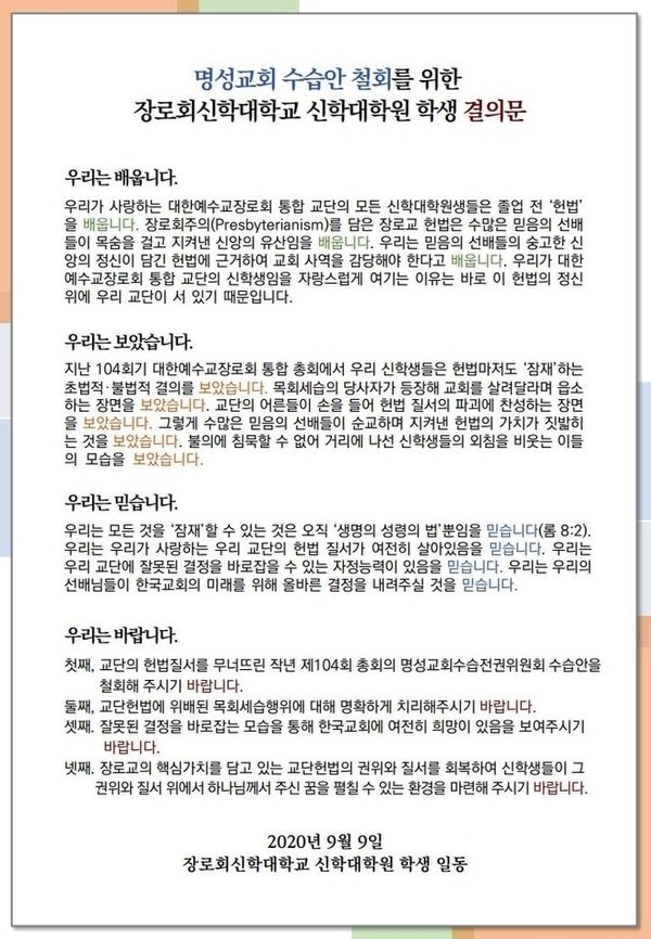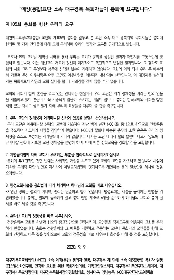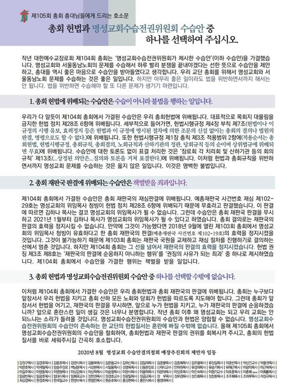 이전 기사보기 다음 기사보기 【통합】제105회 총회 앞두고 각종 성명서 발표 스크롤 이동 상태바 현재위치 News / AI 【통합】제105회 총회 앞두고 각종 성명서 발표 입력 2020.09.07 07:20 수정 2020.09.23 07:31 글자 크기 본문 글씨 키우기 본문 글씨 줄이기 프린트 인쇄하기 SNS 기사보내기 기사저장 다른 공유 찾기 이 기사를 공유합니다 닫기 저작권자 © 본헤럴드 무단전재 및 재배포 금지 관련기사 【통합】제105회 온라인 총회 스케치 【합동】충남노회 정기회 측 대법원 승소확정 최장일 편집인 겸 주필 bonhd77@gmail.com 다른기사 보기 개의 댓글 회원로그인 작성자 비밀번호 댓글 내용입력 댓글 정렬 최신순 추천순 답글순 BEST댓글 BEST 댓글 답글과 추천수를 합산하여 자동으로 노출됩니다. 닫기 더보기 댓글삭제 삭제한 댓글은 다시 복구할 수 없습니다. 그래도 삭제하시겠습니까? 비밀번호 댓글수정 댓글 수정은 작성 후 1분내에만 가능합니다. 본문 / 400 비밀번호 내 댓글 모음 닫기