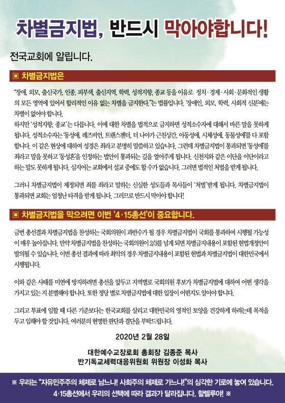 검찰의 불기소 이유서에는 “본건 인쇄물 내용은 피의자들이 속한 교단에서 차별금지법 제정을 반대하는 근거에 대한 설명과 함께 ‘차별금지법에 대한 정당, 후보자의 입장을 알아야 하고, 투표에 임할 때 교회를 살리는 목적을 두고 임해야 한다’는 취지의 내용으로, 인쇄물 내용에 적시된 표현만으로는 지지·추천·반대하는 정당 또는 후보자가 명백히 특정된다고 단정할 수 없다. 따라서 본건 인쇄물 내용만으로는 당선 또는 낙선을 목적으로 하는 후보자를 특정할 수 없으므로 선거운동에 해당한다고 볼 수 없다”고 적시했다.
