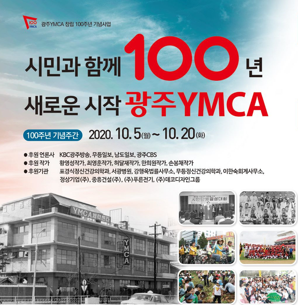 광주YMCA는 1920년 7월 29일 3・1독립운동 이후 시대의 부름에 따라 최흥종 목사를 비롯한 젊은 선각자들이 창립하였으며, 2020년 올해 창립 100주년을 맞았습니다. 광주YMCA와 100년을 함께하면서 지켜주시고 도와주신 회원님들과 광주시민 여러분께 머리 숙여 감사드립니다.
