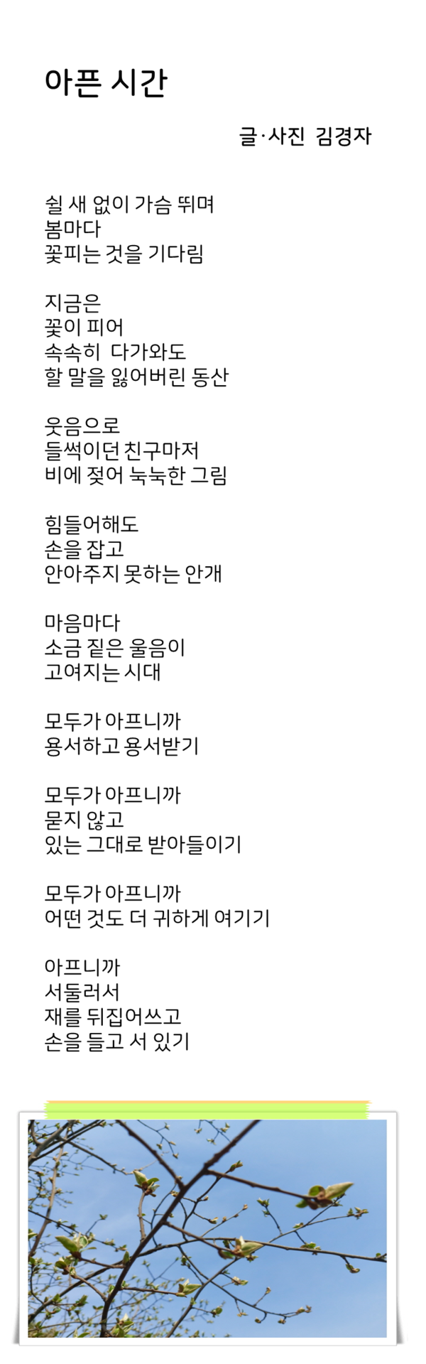 이전 기사보기 다음 기사보기 【김경자 목사】 Psalms 151, 『아픈 시간』, 『소망』 스크롤 이동 상태바 현재위치 문화 【김경자 목사】 Psalms 151, 『아픈 시간』, 『소망』 입력 2020.03.24 21:30 수정 2020.03.27 09:06 글자 크기 본문 글씨 키우기 본문 글씨 줄이기 프린트 인쇄하기 SNS 기사보내기 기사저장 다른 공유 찾기 이 기사를 공유합니다 닫기 저작권자 © 본헤럴드 무단전재 및 재배포 금지 관련기사 【한명철 목사 칼럼】 COVID19 소회(所懷) [사순절 경건, 24일] 믿고 구하는 것은 다 받으리라(마21:18-22) [사순절 경건, 25일] 종교인이냐? 세리와 창녀냐?(마21:23-32) 장국진 목사의 사진세계와 말씀-62 【김경자 목사】 Psalms 151, 『사랑』 【김경자 목사】 Psalms 151, 『여름 풍경』 【김경자 목사】 Psalms 151, 『숲속의 위로』 【김경자 목사】Psalms 151, 『눈꽃』 윤홍식 기자 jesuspointer@naver.com 다른기사 보기 개의 댓글 회원로그인 작성자 비밀번호 댓글 내용입력 댓글 정렬 최신순 추천순 답글순 BEST댓글 BEST 댓글 답글과 추천수를 합산하여 자동으로 노출됩니다. 닫기 더보기 댓글삭제 삭제한 댓글은 다시 복구할 수 없습니다. 그래도 삭제하시겠습니까? 비밀번호 댓글수정 댓글 수정은 작성 후 1분내에만 가능합니다. 본문 / 400 비밀번호 내 댓글 모음 닫기