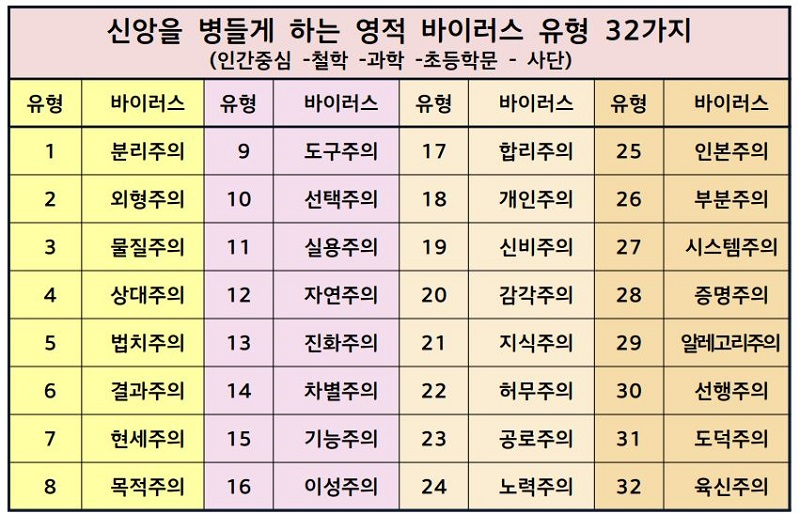 # 다음 표는 필자가 정리한 것으로 영혼을 파괴시키는 헬레니즘 방식으로 스며든 영적 바이러스 유형 32가지 내용이다. 각 교회와 성도들이 자기 안에 있는 영적 바이러스를 진단하는 도구가 되길 바란다.