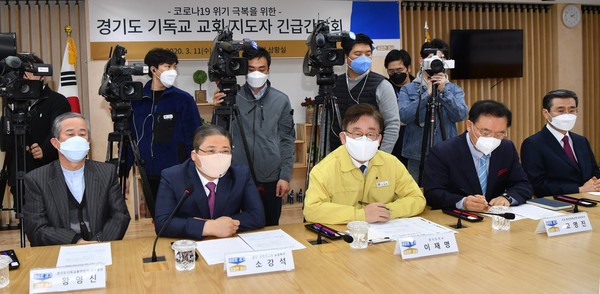 한국교회는 코로나19 사태에 직면하여 전광석화같이 공예배를 중단하고 온라인 예배를 드리는 교회가 많다. 그리고 매주 행정당국으로부터 예배를 중단하라는 전화에 시달리는 목회자도 많다. 지난 주일만 하더라도 경기도는 56% 정도의 교회가 공예배를 드린 것으로 파악되었다. 이에 이재명 경기도지사가 종교집회금지 긴급명령을 발표하는 것을 만지작거리다가, 지난 3월 11일 경기도 기독교지도자 긴급간담회에서 타협안을 제시했다.