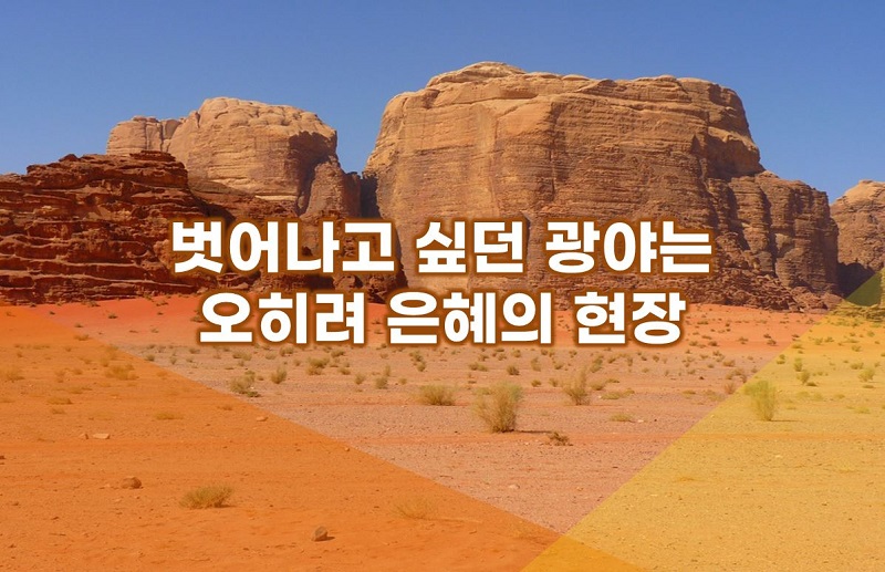 광야는 애굽을 탈출한 히브리 백성이 가나안의 누림을 위해 자격을 구비하고자 훈련 받는 장소다. 그들은 원래 애굽에서 노예 생활을 하던 천민 집단(하비루)이었다. 유브라데 강을 건넌 아브라함에게서 시작된 히브리란 명칭은 선민을 나타내는 표현으로서 바울 자신도 스스로 ‘히브리인 중의 히브리인’이라 할 정도로 오랜 역사적 배경을 지니고 있다. 하나님이 그들의 조상 아브라함에게 하셨던 약속을 성취코자 430년간 종살이하던 히브리 백성을 돌아보셨다. 하나님의 권능이 애굽의 신들을 심판함으로 촉발된 출애굽은 장자와 모든 생물의 처음 난 것이 죽는 재앙에서 절정을 이루었다. 투항의 백기를 든 애굽의 바로는 엄청난 노동력이 빠져나가는 것을 속수무책으로 바라보았다. 히브리 백성은 압제의 쇠사슬에서 놓여나 드디어 자유민이 되었다. 전 민족이 풍요롭게 살 수 있는 축복의 땅까지 예비 되어 있었다. 광야는 애굽에서 형성된 노예근성을 뿌리 채 뽑아내기 위한 훈련소로서는 아주 적합한 곳이었다. 하나님이 마련하신 훈련과목은 녹록치가 않았다. 그들이 힘겨워 역반응을 보일 때는 기적적인 돌보심이란 안전장치까지 준비하셨다.