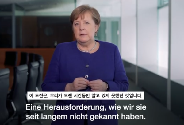 전국적인 수준에서 그리고 주 정부 측면에서 경제적 사회적 그리고 문화적 손상을 막기 위해 모든 해결책을 동원하고 있습니다. 하지만 이 상황에서 여러분의 도움이 왜 더해져야 하는지 알려드리고 싶습니다. 현재 정부 측에서도 개인의 노력과 전문가들과 RKI의 조언을 듣고 현재 코로나 바이러스의 치료법과 백신을 연구하고 있습니다. 그래서 저희는 시간이 필요합니다. 이 코로나 바이러스가 퍼지는 시간을 몇 달간으로 늘려서 저희가 백신을 완성시키고 환자들에게 모든 가능한 치료와 도움을 줄 수 있게 하기 위함입니다.