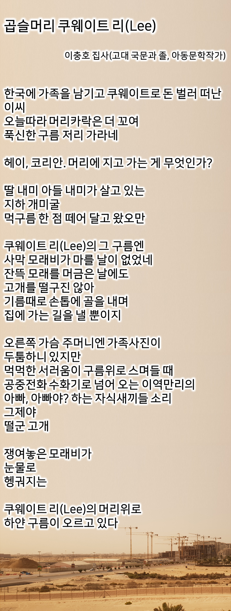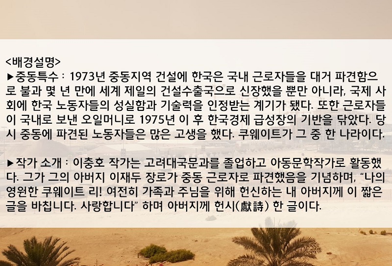 쿠웨이트 사막에서 가족을 위해 고생하는 아버지를 위해 받친 아들의 헌시이다. 진정성이 깃든 아들의 마음이 고스란히 스며있다.