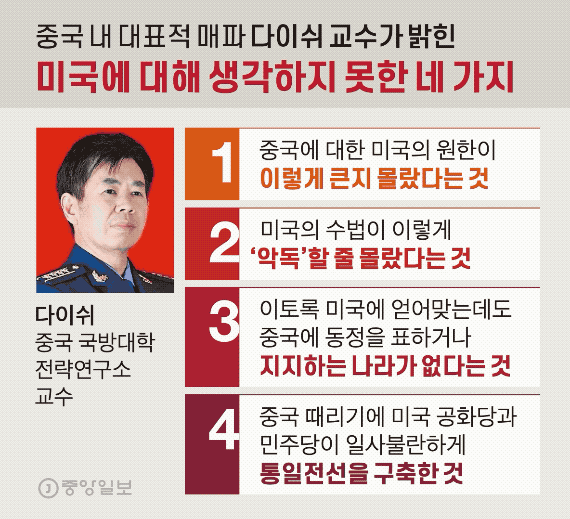 지난 7월 20일자 중앙일보에 다이쉬(戴旭) 중국 국방대학 전략연구소 교수가 지난 3월 말 발표한 연설이 최근 중국에서 커다란 화제가 되고 있다. 미국의 중국 때리기가 사상 유례없이 전방위적으로 펼쳐지면서 중국에서 그동안 미국을 잘못 봤다는 통절한 ‘반성’이 일고 있다. 먼저 중국이 미국에 생각 못 한 네 가지는 다음돠 같다..