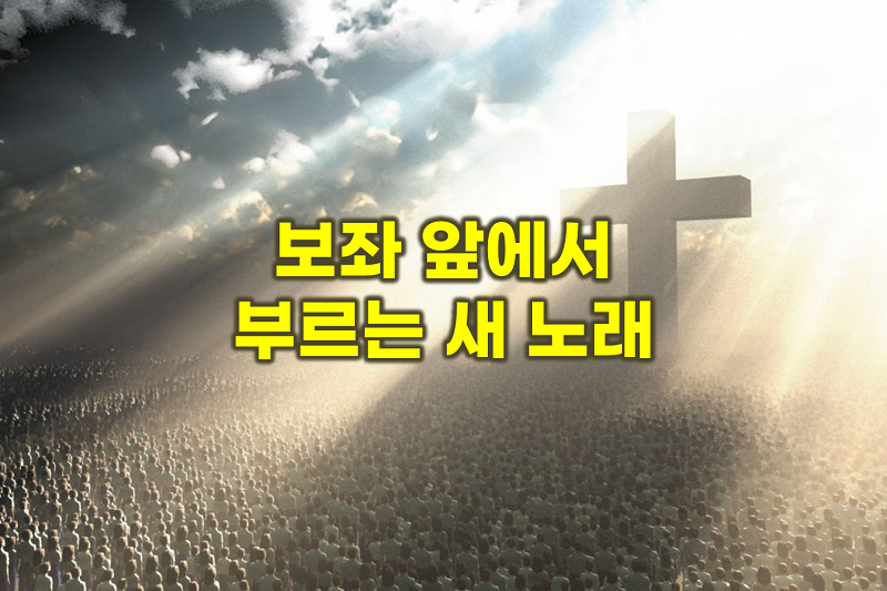 어디서 새 노래를 부르는가. 보좌 앞과 네 생물과 장로들 앞이다. ‘보좌 앞에서’는 ‘하나님 앞에서’를 의미한다. 보좌는 하나님 이름을 나타내는 완곡어법이다. 보좌와 보좌를 둘러싸고 있는 자들을 강조한다. 새 노래는 하늘에서 펼쳐지는 최고의 경배다. 이 노래를 부른 장소는 하늘 궁정이다. 새 노래가 불러져야 할 유일하게 적절한 장소다. 요한계시록에는 네 개의 찬송이 점진적인 과정을 거치며 펼쳐진다. 첫 번째 새 노래는 어린 양이 일찍 죽임을 당하여 사람들을 피로 사서 하나님께 드린 것을 노래한다. 두 번째는 성도들이 짐승을 물리치고 승리한 것을 찬송한다. 세 번째는 모세의 노래와 어린 양의 노래다. 최후의 심판 재앙에 나타나 있는 하나님의 공의를 찬송한다. 네 번째는 메시야의 혼인 잔치를 찬송한다.