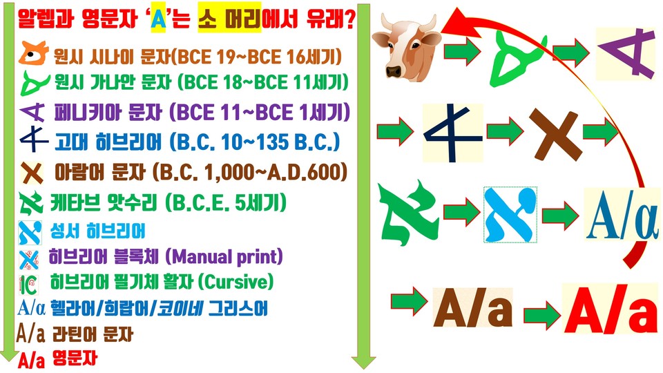 ▶“알렙”과 영문자 ‘A’를 기원전 3,850여 년경까지 거슬러 올라가면, 소머리를 그림문자로 사용한 것에서 유래