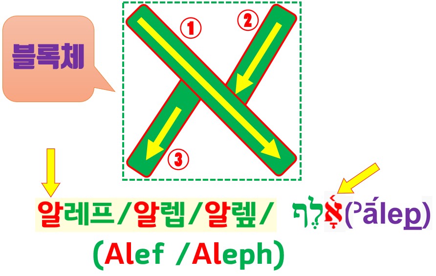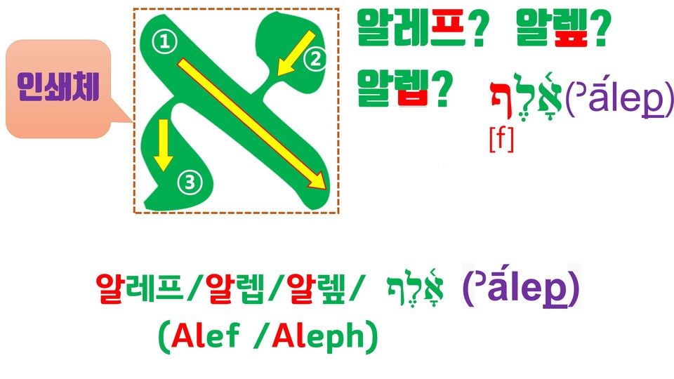 ▶’알레프’의 마지막 문자 ‘페’ (פ)란 글자는 f 발음이 난다. 그래서 ‘알래프’를 ‘알렙’(알렢)이라고 발음하기도 한다.