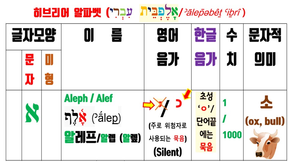 ▶문자적 의미는 소머리를 상징한다. 즉 ‘알렙’을 BCE 3,850년까지 거슬러 올라가면 소머리를 그림문자로 사용한 것에서 유래되었음을 알 수 있다.