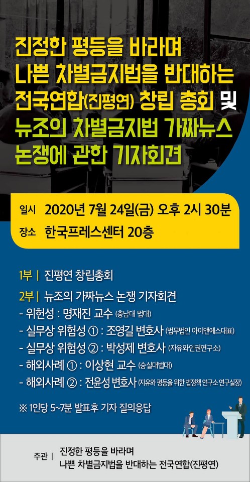 전국의 486개 단체가 참여하는 「진정한 평등을 바라는 나쁜 차별금지법반대 전국연합」(진평연)은 지난 7월 24일 창림총회를 개최하고 성명서를 발표했다.