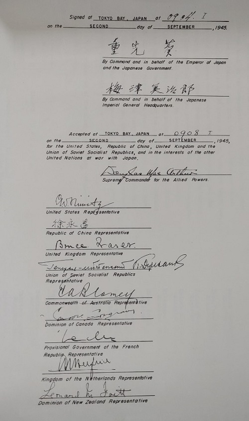 일본의 항복 문서를 보면 연합군 사령관과 2차대전에 참전한 국가의 대표들 서명이 있다. 하지만 당시 한국은 일본의 식민지였기에 아무 발언도 없고, 항복 문서에는 우리나라에 대한 언급은 없었다. 그런데도 2차대전에 미국이 승리함으로 우리는 꿈에 그리던 광복과 해방을 맞은 것을 그저 감사할 뿐이다.