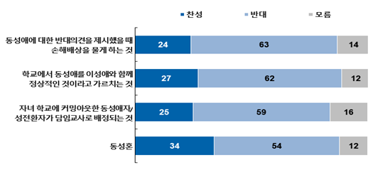 차별금지법과 관련 ‘동성애에 대한 반대의견을 제시했을 때 손해배상을 물게 하는 것’에 대해 63%가, ‘학교에서 동성애를 이성애와 함께 정상적인 것이라고 가르치는 것’에 대해 62%가, ‘자녀의 학교에 커밍아웃한 동성애자나 성전환자가 담임교사로 배정되는 것’에 대해 59%가 각각 반대하는 것으로 나타났다.