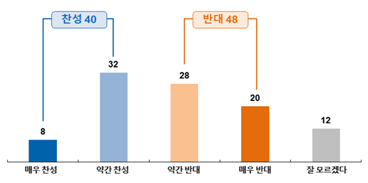 찬성 40%, 반대 48%, 무응답 12%로 반대의견이 찬성의견보다 높은 것으로 나타났다. 특히 종교별로 차이를 보이는데 개신교인의 경우 찬성 32%, 반대 61%로 타종교인/무종교인 대비 반대 비율이 가장 높았다. 또한, 연령별로 50대 이후 반대 의견이 높아지는데, 60대 이상 고연령층은 종교와 상관없이 찬성 35%, 반대 55%로 반대의견이 크게 높았다.