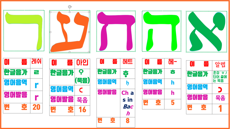 ▶레쉬(ר)는 엄격히 말하면, 후음 글자는 아니지만 혀 떨림 소리인 진동설음(振動舌音)소리가 나므로 후음 소리와 비슷해서 레쉬(ר)란 글자도 후음 글자처럼 사용되고 있다.