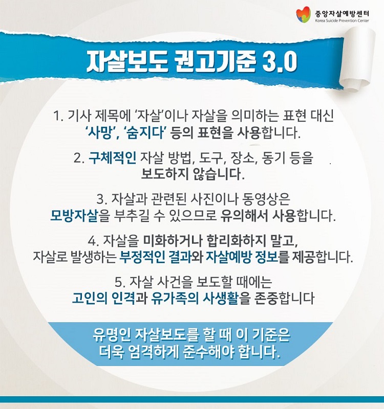 자살이 전염된다는 것은 잘 알려진 사실인데, 오늘날 미디어가 자살 전염의 중요한 매개체역할을 하고 있습니다. 왜냐하면 대부분의 사람들이 자살문제 및 현상을 미디어를 통해 알고 있기 때문입니다. 이처럼 미디어의 광범위한 자살보도는 모방자살을 촉발시킬 수 있다는 점에서 오랫동안 논의되어왔습니다.