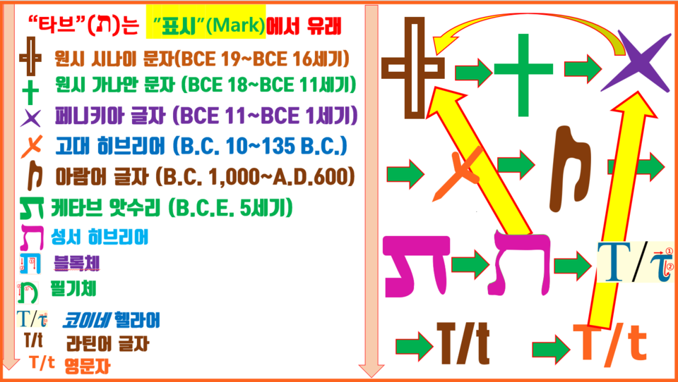 ▶성서 히브리어 마지막 타브(ת)란 글자를 원시 시나이 시대까지 추적해 보면, 누군가 위치와 장소를 식별하기 위한 “표시”(mark) 모양을 상형문자(그림문자)로 사용하던 것에서 유래했다.
