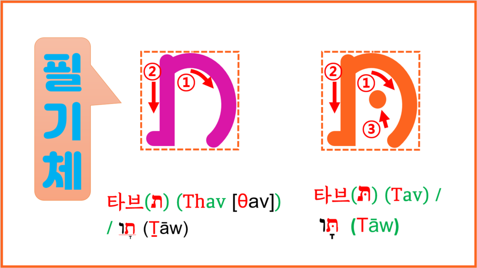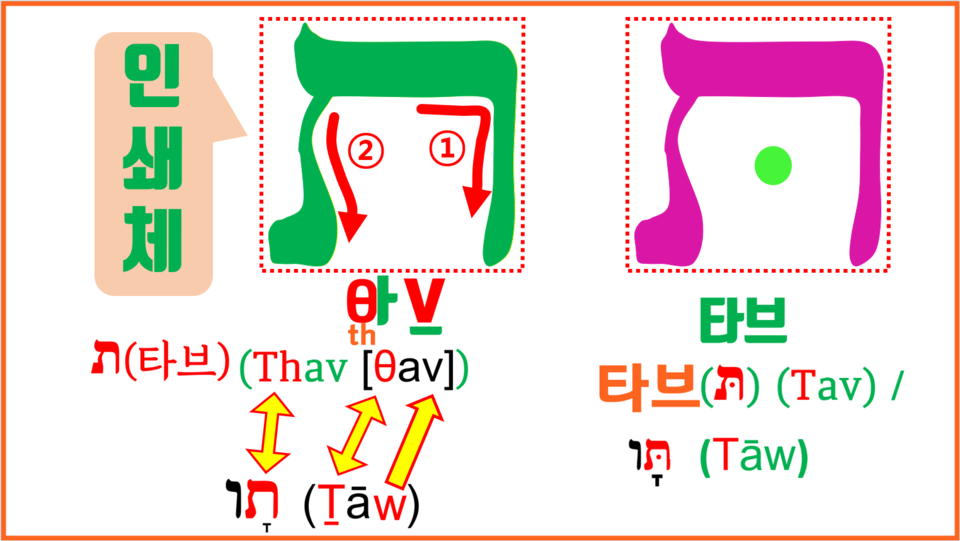 ▶오른쪽 글자처럼 가운뎃점이 있으면, 이것이 타브 (Tav) 소리가 난다.