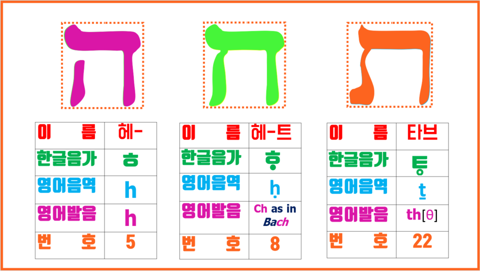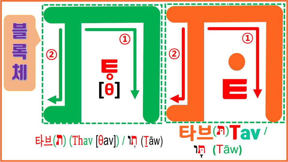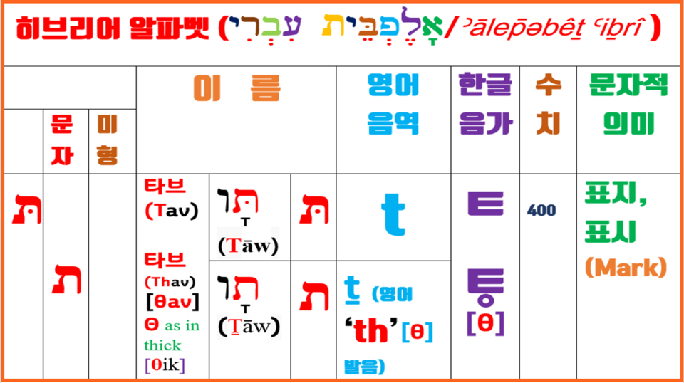 ▶왼쪽의 테트란 글자와 오른쪽의 타브(תּ)란 글자 모두 영문자 티 (t) 소리가 난다.