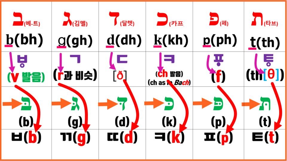 ▶히브리어 문법에서 영문자 아래 밑줄 표시가 있는 모든 영문 음역 표기는 베가트 케파트 글자이며, 약하게 발음하라는 표시이기도 하다.
