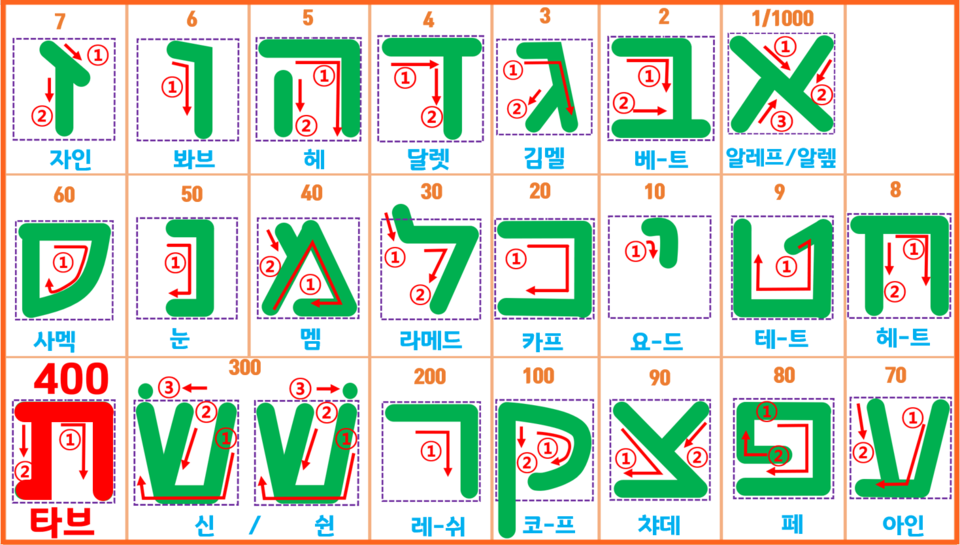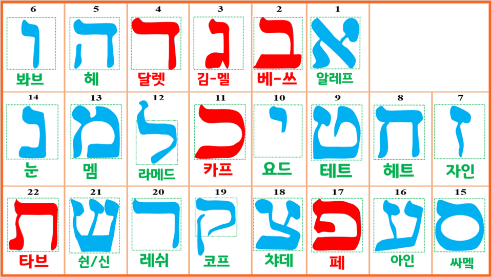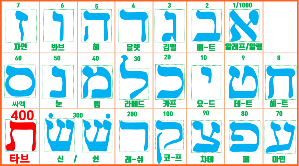 ▶오른쪽 글자는 마지막 22번째 글자 싸브(ת)이다.