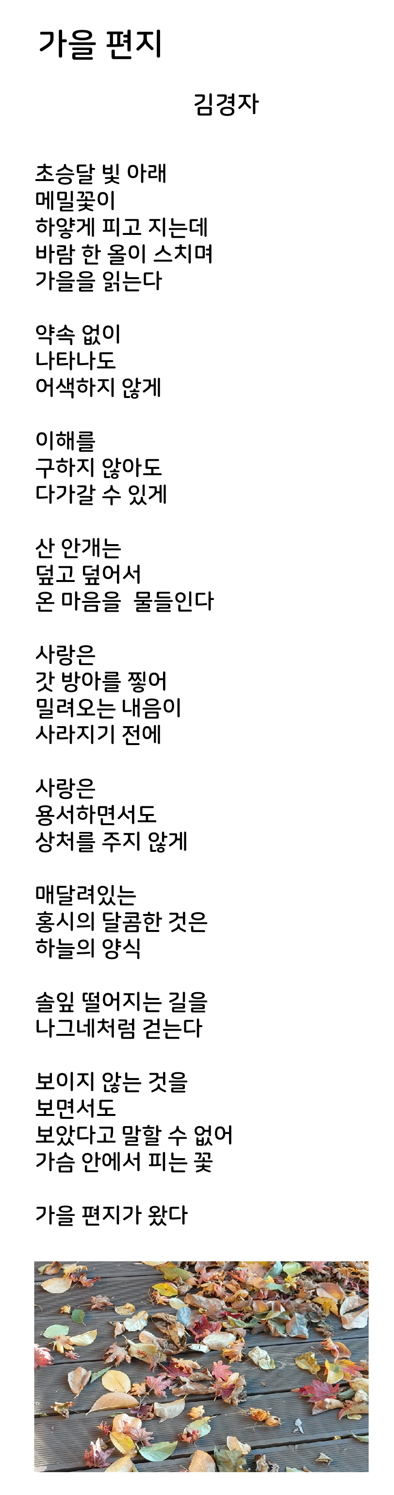이전 기사보기 다음 기사보기 【김경자 목사】 Psalms 151, 『가을 편지』 스크롤 이동 상태바 현재위치 문화 【김경자 목사】 Psalms 151, 『가을 편지』 입력 2020.11.06 08:04 수정 2020.11.06 08:24 글자 크기 본문 글씨 키우기 본문 글씨 줄이기 프린트 인쇄하기 SNS 기사보내기 기사저장 다른 공유 찾기 이 기사를 공유합니다 닫기 저작권자 © 본헤럴드 무단전재 및 재배포 금지 관련기사 【김경자 목사】 Psalms 151, 『구월의 기도』 【김경자 목사】 Psalms 151, 『숲속의 위로』 『 게으름과 낭비를 지원하는 복지정책 』 [김수목사칼럼] 성경을 보는 눈 [최원영목사 칼럼]“교회개척을 쉽게 하면 안 되는 이유 25가지” 이 말에 당신은 동의하는가? 【김경자 목사】Psalms 151, 『눈꽃』 [추수엽목사 소망의 시간] 아침의 노래 김경자 목사 webmaster@bonhd.net 다른기사 보기 개의 댓글 회원로그인 작성자 비밀번호 댓글 내용입력 댓글 정렬 최신순 추천순 답글순 BEST댓글 BEST 댓글 답글과 추천수를 합산하여 자동으로 노출됩니다. 닫기 더보기 댓글삭제 삭제한 댓글은 다시 복구할 수 없습니다. 그래도 삭제하시겠습니까? 비밀번호 댓글수정 댓글 수정은 작성 후 1분내에만 가능합니다. 본문 / 400 비밀번호 내 댓글 모음 닫기