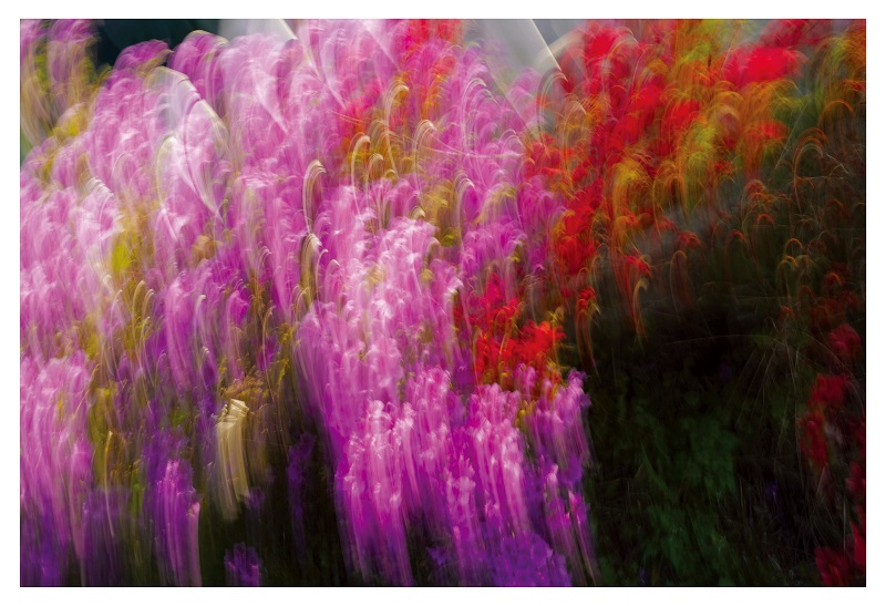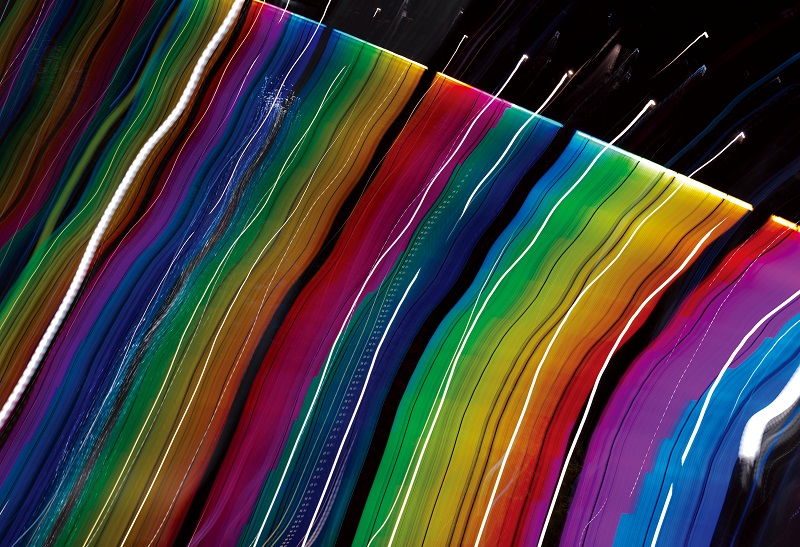The reason why the artist chose to take pictures of light, manipulating the camera, is that the camera is an optical instrument that recognizes the light of an object. Light makes our perception of the subjects vary according to the structure of the colors accepted and reflected by the objects in the range of the rainbow colors in visible light. But the world of light that the cameras recognize can be much more sensitive than we humans perceive. The artist recognizes this point. That’s why his intention is to capture as deeply as possible the range of light that the camera can recognize. With the camera lens moving and the aperture and the shutter having a certain range of time and light, he captures the forms of the new, constant motions created by the light of all the things.